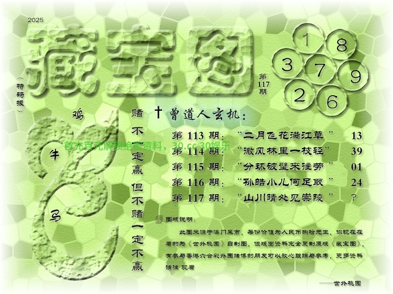 | 117期港彩新版藏宝图 山川晴处见崇陵 解:本期山川晴处见崇陵解地肖蛇羊鸡狗鼠虎 综合生肖:虎马兔蛇狗猪鸡羊鼠 |